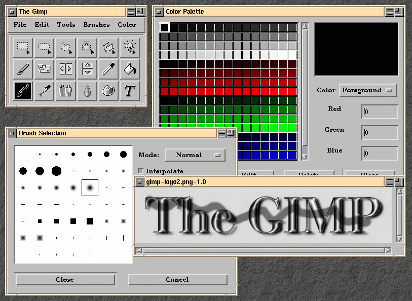 The GIMP is an image manipulation program written by 2 UC Berkeley undergraduates. It slices, it dices, it fillets...and it allows an average human to create decent looking graphics. (For instance, the above logo can be created from scratch in the GIMP in approximately 10 minutes). Warning: mileage may vary.